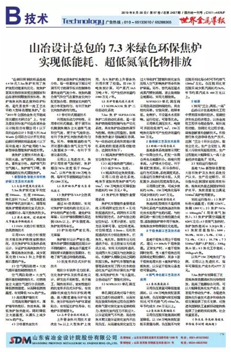 “SDM大型綠色智能焦?fàn)t技術(shù)”是山冶設(shè)計(jì)與意大利PW公司合作的代表世界一流工藝水平的大型焦?fàn)t技術(shù)。由山冶設(shè)計(jì)進(jìn)行整體規(guī)劃及設(shè)計(jì),采用了分段加熱、非對稱式煙道、薄爐墻、單孔調(diào)壓、火焰分析模型等技術(shù),具有技術(shù)成熟先進(jìn)、結(jié)構(gòu)嚴(yán)密合理、單孔容量大、占地面積小、熱工效率高、自動化水平高、環(huán)保指標(biāo)先進(jìn)等諸多優(yōu)點(diǎn)。在焦?fàn)t爐體、焦?fàn)t機(jī)械、工藝裝備、自動化和環(huán)保水平等方面代表國際先進(jìn)水平。同時(shí),在世界上首次運(yùn)用焦?fàn)t爐內(nèi)脫硝工藝,氮氧化物排放指標(biāo)符合國家最嚴(yán)環(huán)保排放標(biāo)準(zhǔn)。