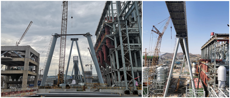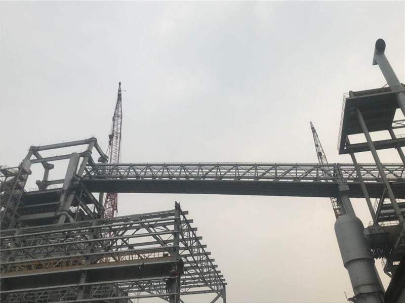 5#通廊在4000噸米塔吊和350噸履帶吊相互合力下,經(jīng)過近6個小時的吊裝,順利達到68.90米就位高度,按計劃節(jié)點提前7天完成高爐主皮帶通廊的整體鋼結(jié)構(gòu)安裝。這是萊鋼1#3800m3高爐本體工程中吊裝高度最高、單體重量最重、跨度最大的鋼結(jié)構(gòu)件,5號通廊成功安裝,為后續(xù)設(shè)備安裝、通廊封閉、設(shè)備單機調(diào)試等創(chuàng)造了有利條件,同時給其他各參建單位做了號的榜樣,便于帶動其他工序積極作業(yè)施工。