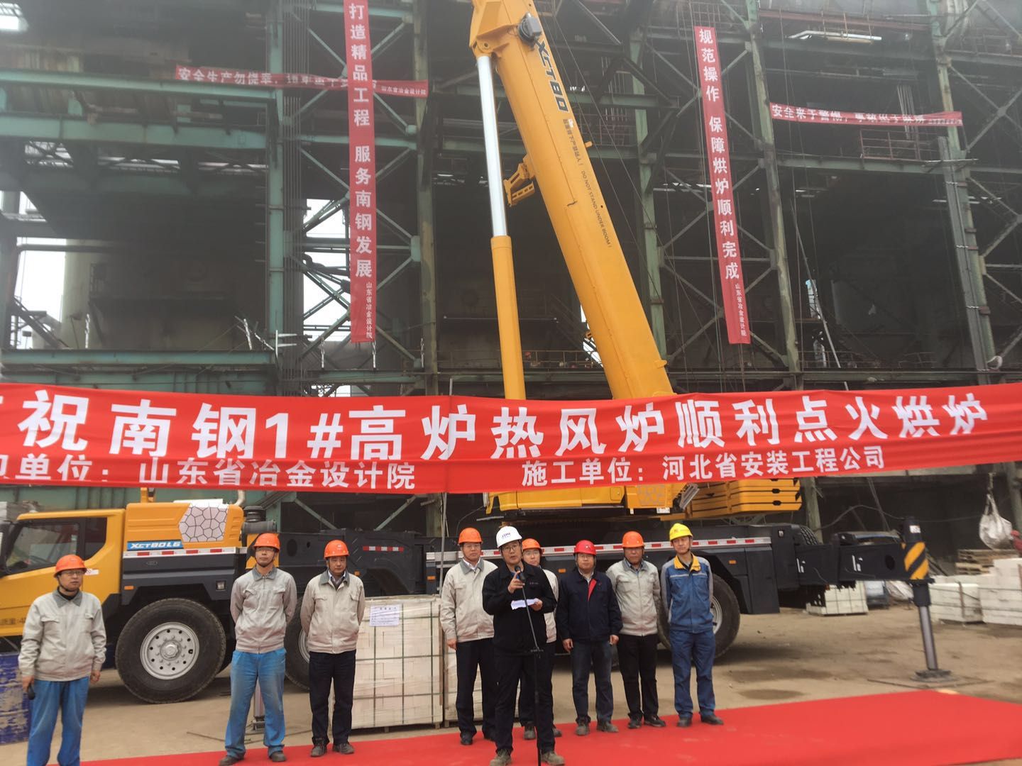 南京鋼廠1#高爐配置四座內燃式熱風爐,改造前風溫低,隔墻香蕉變形坍塌嚴重。熱風爐分公司憑借成功改造的三十余座內燃式熱風爐的經驗及最合理的價格,贏得了業主的信任與重托。此項目于9月5日正式開工,到11月27日點火烘爐,共計80天的時間,在這80天時間里,先后完成了老熱風爐系統的拆除及熱風爐新建,完成耐材拆除量11000噸,鋼結構拆除量1300噸,設備拆除量800噸,新建鋼結構安裝量1100噸,設備安裝量700噸,耐材砌筑量10000噸。